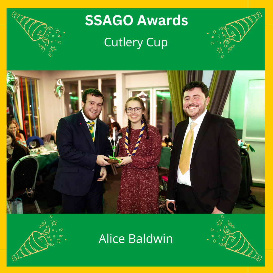 Whilst there were many nominations for the Cutlery Cup, the new Team Pink found Alice to be the standout nominee. Alice has made her dedication clear throughout her time in SSAGO. From being on the Rally of Games committee, to helping out with ReBaR, Rali Cymru, Oktoberfest and helping create badges for a multitude of events, her presence has made SSAGO better.